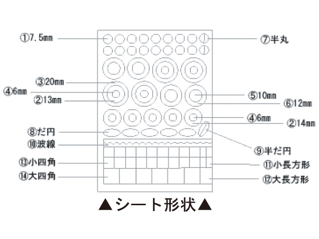 四角(大・小)、丸(大・小)、半円、穴あき丸、だ円、半だ円、波線など、いろいろな形にカットされたシートが、指で簡単にはがせます。