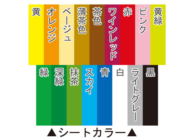 | カラー | 黄・オレンジ・ベージュ・薄茶色・茶色・ワインレッド・赤・ピンク・黄緑・緑・深緑・抹茶・スカイ・青・白・ライトグレー・黒 |