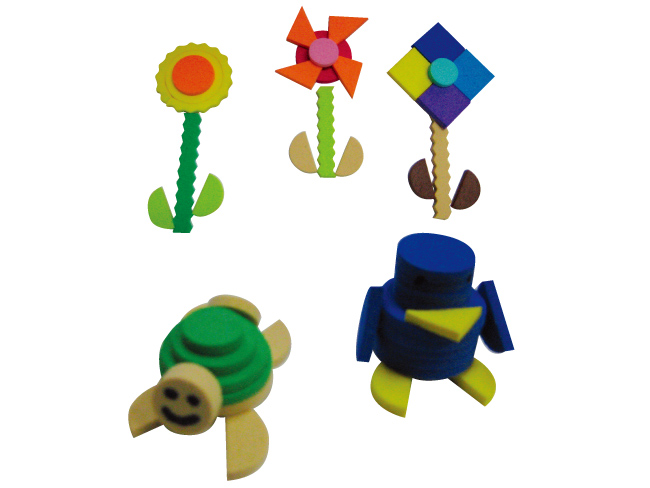 もこもこアートはスポンジ製のシートです。肉厚なので、平面に貼って絵画のような貼り絵や、積み重ねて立体を作ることもできます。箱の中にシートを組み合わせて貼っていくことで箱庭やミニチュアドールハウスのような、小さな部屋や装飾品を作ることができます。手でちぎったり、ハサミやカッターで細かくすることなどで、紙の貼り絵にはできない、斬新な立体作品が作れます。